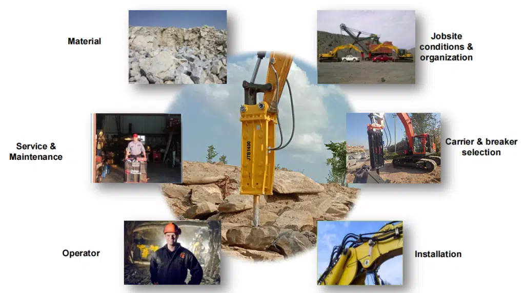 The actual productivity rate of the hydraulic breaker will be affected by broken material, installation, carrier conditions, site conditions & organization, transportation and operators skills.