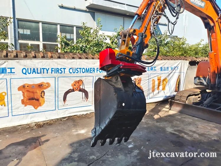 The tip of JT-02 tilt rotator gripper has a holding force of up to 300 kg, which increases the effective load-bearing capacity of the excavator. The gripper uses a mechanical connecting rod to control its synchronization, which is more reliable than a hydraulic synchronization valve. It can also easily clamp objects in narrow corners, and has a wide range of applications.