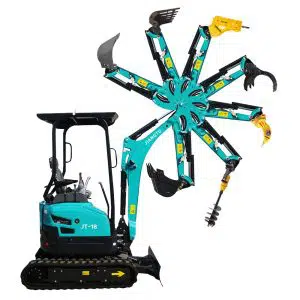The JT18 mini digger weighs 1.76ton, has a width of 980mm, an extensive range of 3540mm, and a digging depth of 2310mm. Its size and weight are both convenient for trailer towing; its size allows it to pass through ordinary doorways and is very suitable for working in restricted passages. It is sometimes called compact excavator, micro excavator, or small excavator.