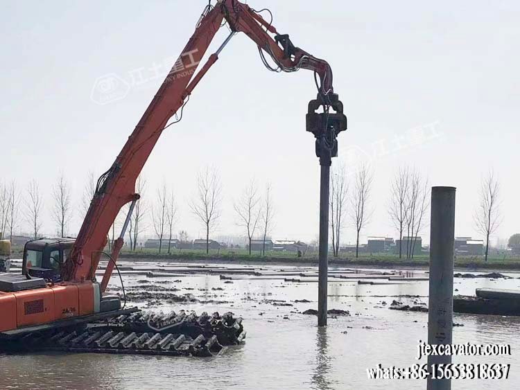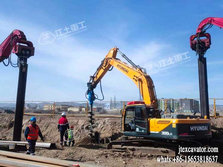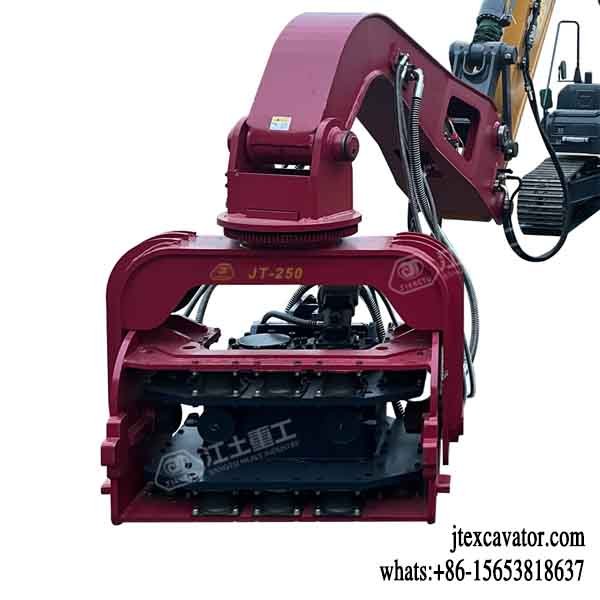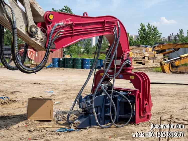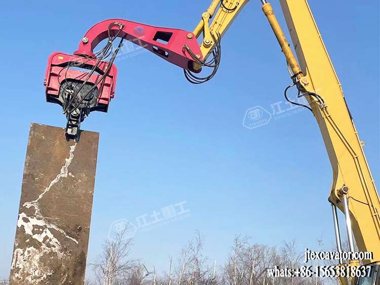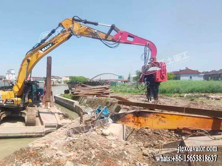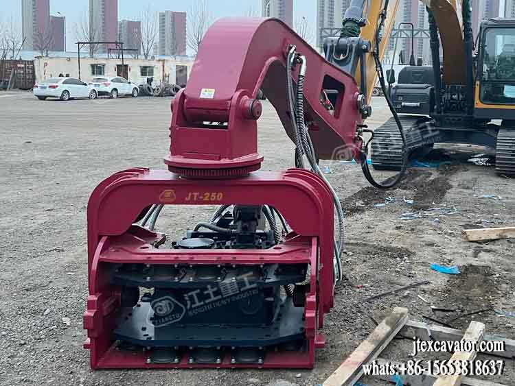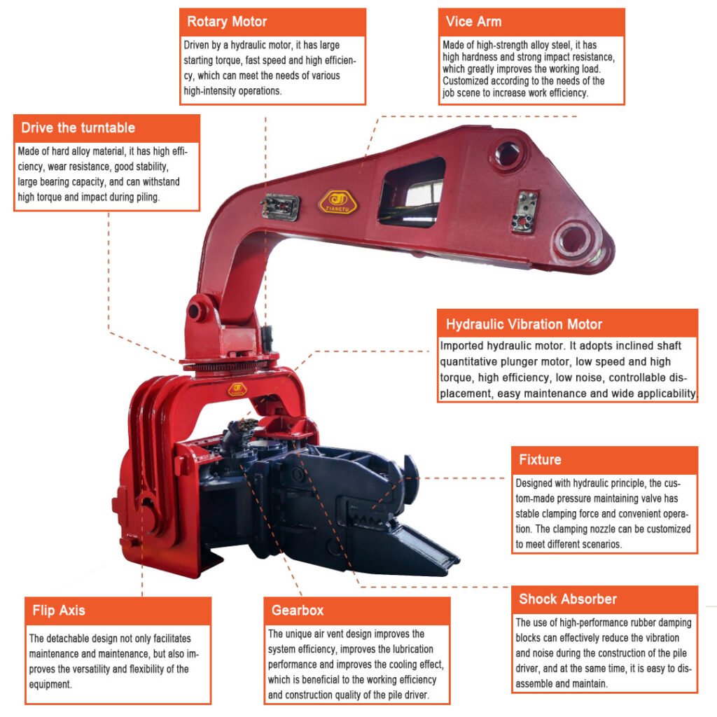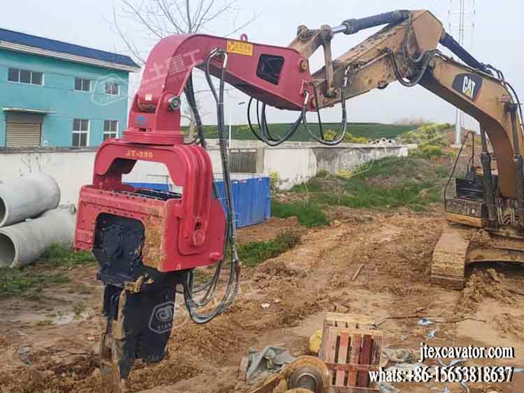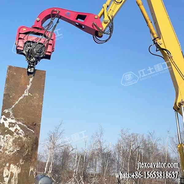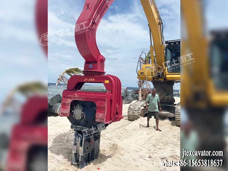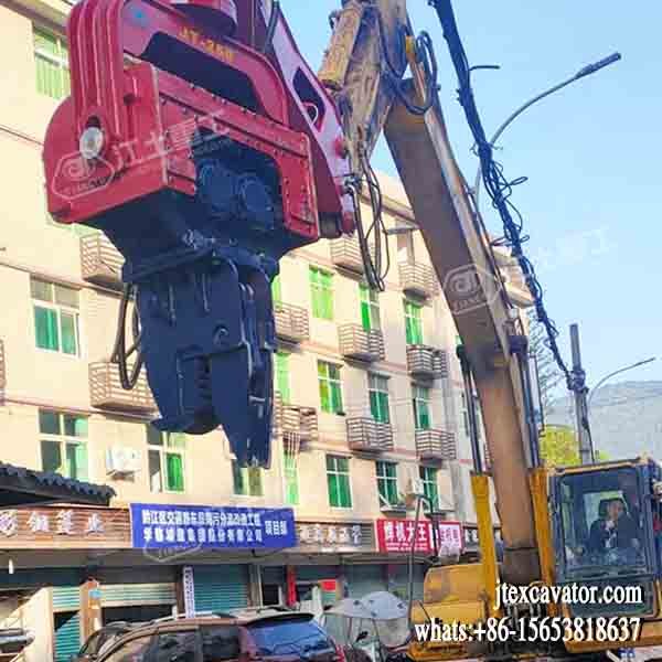 JIANGTU vibratory pile driver for excavator is a hydraulic attachment designed to be mounted directly on an excavator for fast and efficient pile driving and extraction. by generating high-frequency vertical vibration, this excavator-mounted vibratory pile driver significantly reduces soil resistance, allowing piles to be installed or removed quickly with minimal noise and ground disturbance.